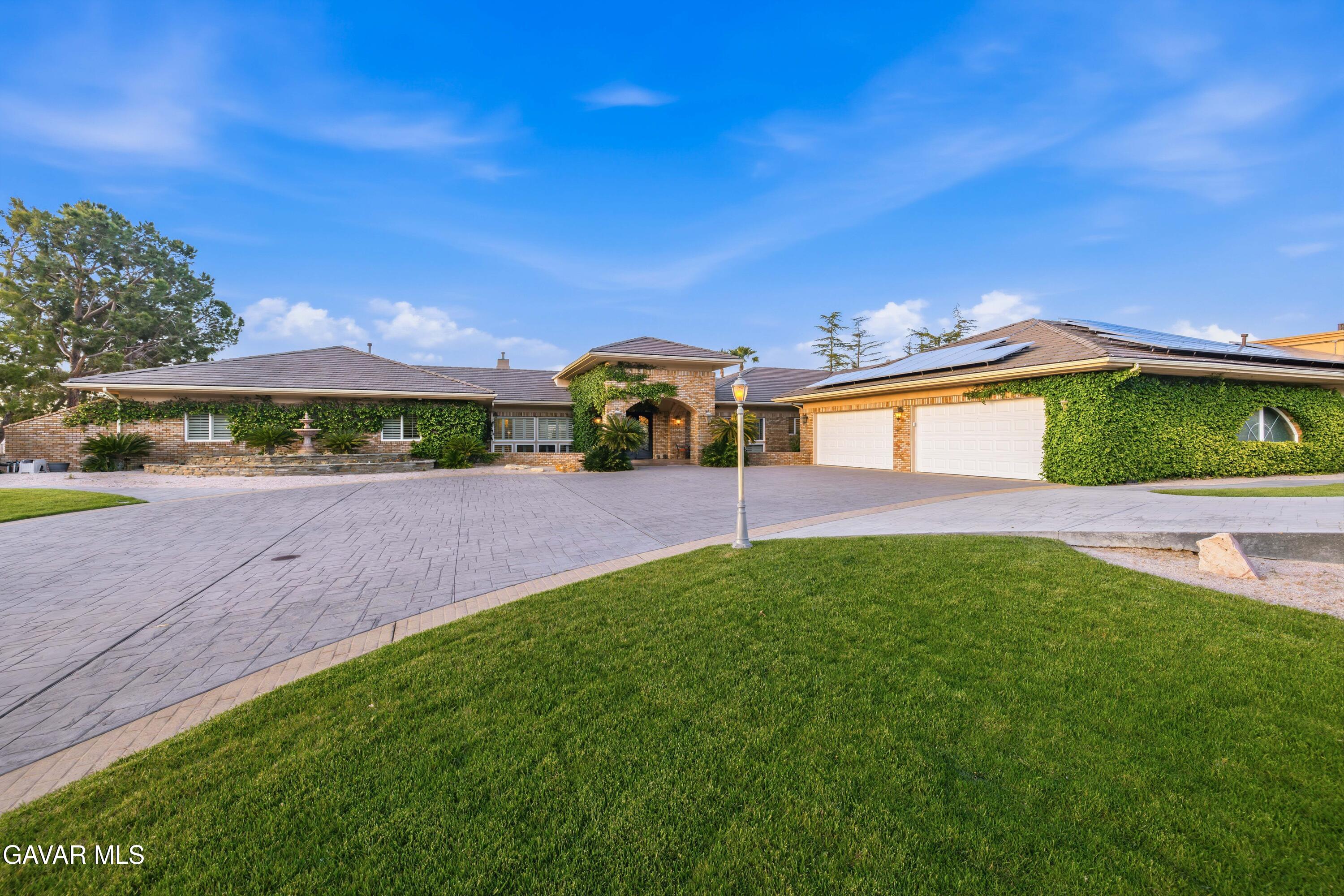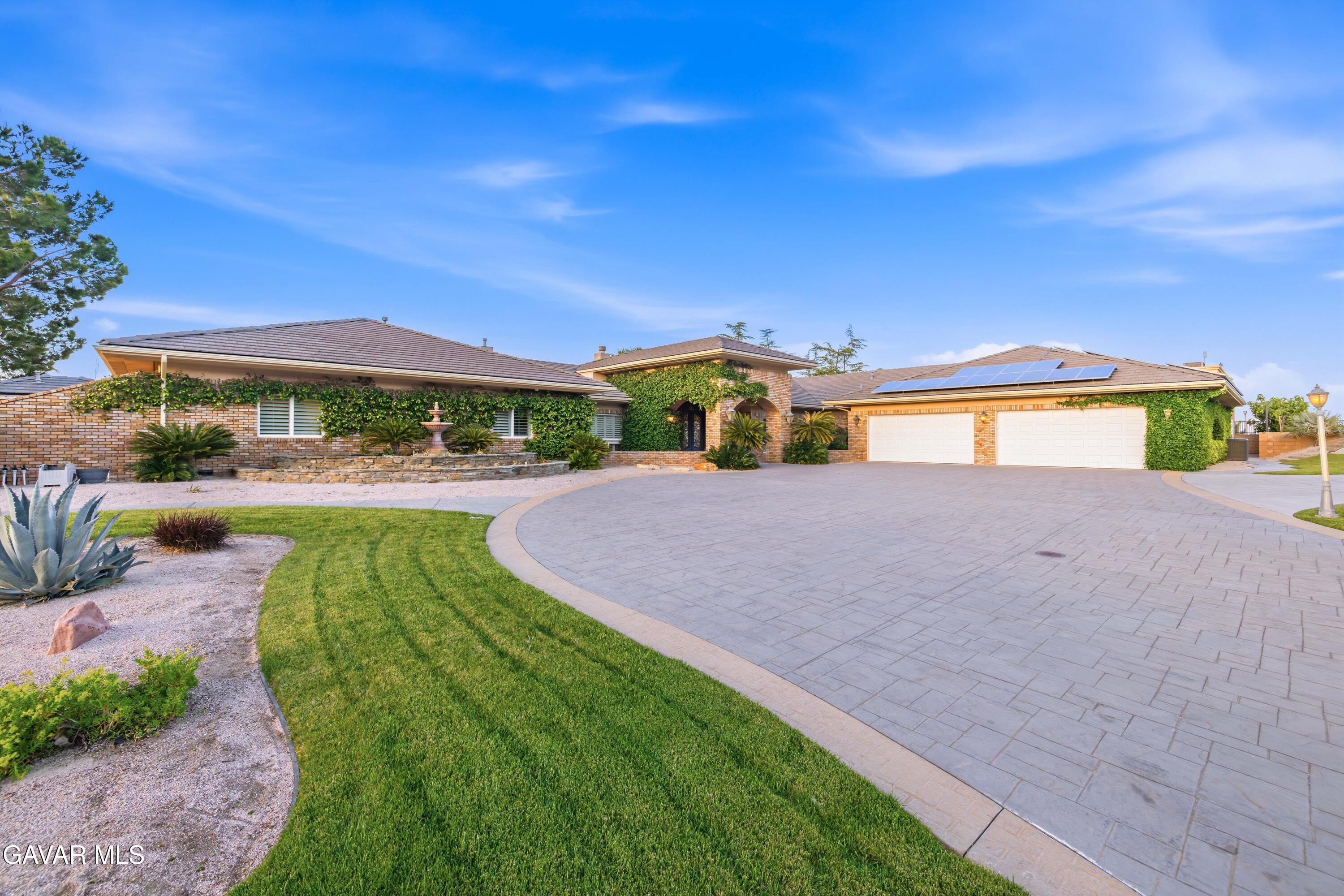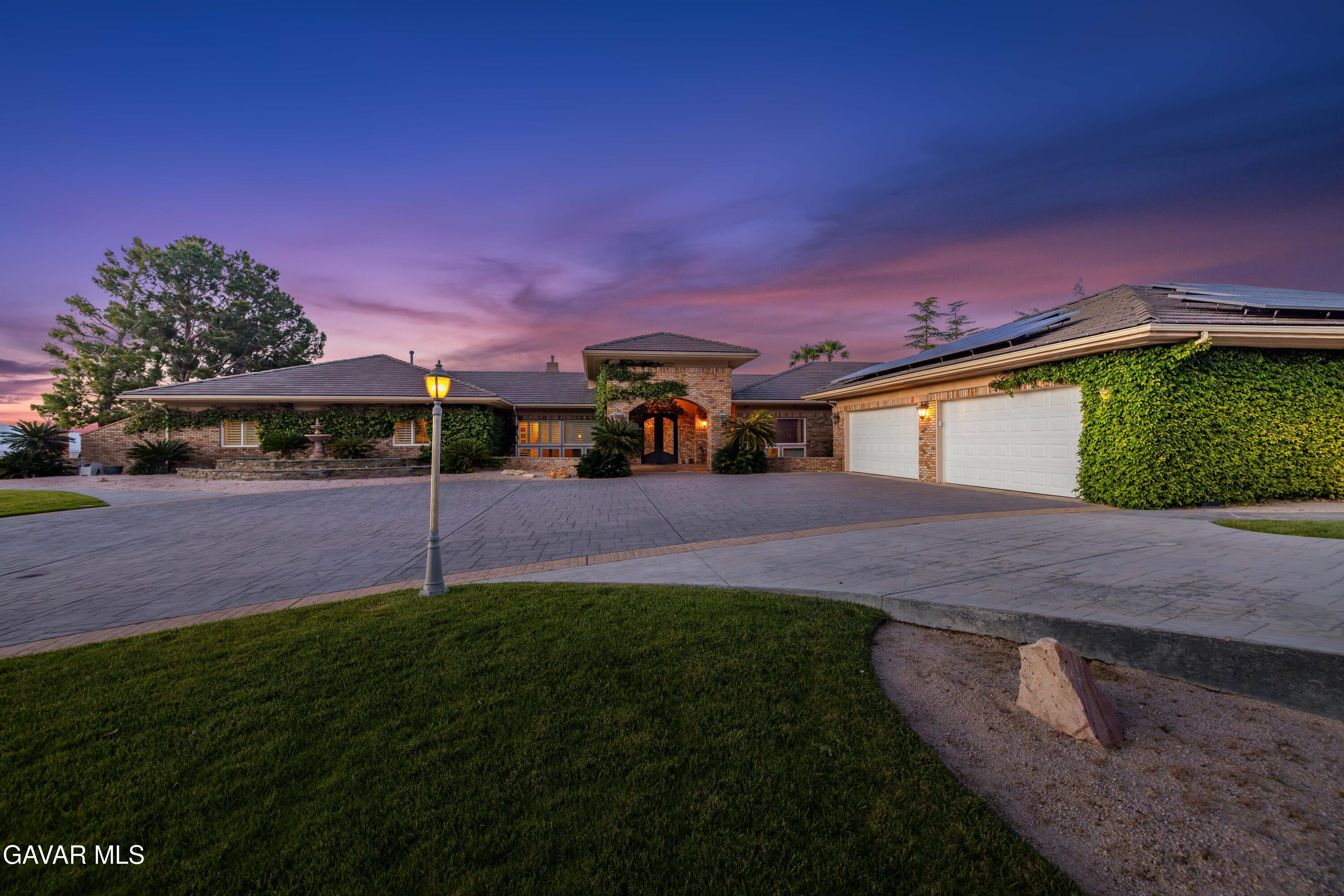 Discover the Largest Single-Story Estate on the Market in West Palmdale with NO HOA & NO MELLO ROOS. Perched on a private hilltop with breathtaking valley views, this extraordinary single-story residence is the largest home currently available in the area, offering an unmatched combination of scale, luxury, and one-of-a-kind amenities. Gated entry and a lighted driveway welcome you to a resort-style property that redefines upscale living. Step into your own private oasis featuring a sparkling pool with water slide, spa, outdoor kitchen, sunken fire pit, outdoor shower, and beautifully landscaped gardens. A large covered patio provides the perfect setting for entertaining, while the front of the property boasts a fenced, lighted sports court ideal for basketball, tennis, pickleball, and more. A four-car garage and solar system complete the impressive exterior. A dramatic entry opens to formal living and dining rooms, each showcasing dual-sided fireplaces and sweeping views of the outdoors. The gourmet kitchen impresses with crisp white cabinetry, a generous island, double ovens, double dishwashers, and a comfortable eat-in area. Flowing seamlessly from the kitchen and family room is a full-size bar with countertop seating, built-in shelves, sink, and refrigerator, perfect for hosting. The spacious family room features a fireplace and built-in bench seating with direct access to the rear yard. A private office offers stunning custom built-in bookshelves and abundant workspace. Every guest bedroom includes its own full bathroom, while the oversized laundry room provides ample storage, built-in cabinets, a sink, and hanging space. The luxurious primary suite is a true retreat, offering direct rear-yard access, a fireplace, built-in media center, coffee bar, and a spa-like en-suite bathroom with dual vanities, a soaking tub, shower, sauna, and an enormous walk-in closet complete with its own laundry facilities. Additional highlights include a fully equipped gym with mirrors and ceiling fans, a versatile bonus room with French doors to the yard, and a dedicated home theater with theater-style seating.